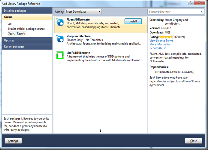 NHibernate supports built it configuration via xml, an example can be found here. Also, stating with NHibernate 3, NHibernate supports configuration via code using the NHibernate.Cfg.Loquacious namespace, more on that can be found here. As I said before, I rather work with FNH with provides mappings and configuration via code, so from here on that’s what we’ll be focusing on.